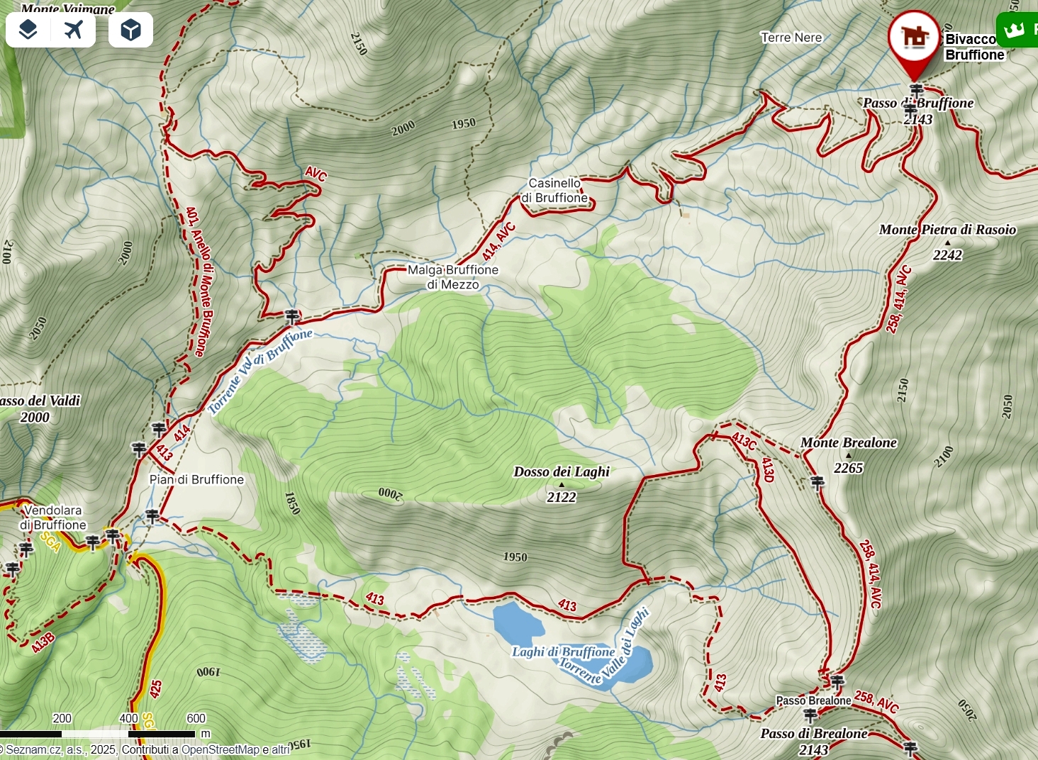 Bivacco Passo di Bruffione (m 2143) e Laghetti di Bruffione (m 1888), dalla località Gaver. Giro ad anello I due laghetti di Bruffione sono situati nella Valle dei Laghi, in alta Val Sabbia, nel comune di Bagolino. Sono vicinissimi al Trentino, tanto che in questa escursione ad anello per un buon tratto dopo il Passo di Bruffione, si cammina a ridosso del confine. I due laghetti sono separati da un ristretto lembo di terra e in caso di pioggie abbondanti o di piena, diventano uno solo. Nelle belle giornate il paesaggio è veramente incantevole grazie al contrasto dei vari colori come il blu dell’acqua, il verde dell’erba, il rossiccio del terreno e l’azzurro del cielo. Itinerario: Come per l’escursione relativa al giro del Blumone, bisogna raggiungere la località Gaver con la provinciale che collega il Passo di Crocedomini a Bagolino. Superato l’albergo Blumone e arrivati al piazzale antistante il “Bar e Alimentari Bruffione” si può parcheggiare. Poco sotto si prende una strada sterrata sulla sinistra che arriva sino al ponte per l’attraversamento del fiume Caffaro, lo si attraversa e si prende a destra camminando sulla stradetta (CAI 401) che prima con direzione sud e poi est giunge alla Piana del Bruffione in poco meno di un’ora. Ora si segue il sentiero (CAI 414) che porta al Passo di Bruffione (NE), sempre su fondo sterrato, passando in sequenza, prima dalla Malga Bruffione di Sotto (m 1750) situata a lato della citata piana, poi dalla Malga Bruffione di mezzo (m 1820) e fino al Casinello di Bruffione (m 1883). Qui la sterrata lascia il posto ad un vecchio tracciato di strada militare in discrete condizioni col quale si raggiunge, tra prati e ruscelli immersi nel verde della montagna, il grazioso bivacco posto al Passo di Bruffione (m 2143). Nel periodo di fine primavera i prati sono ricoperti da abbondanti fioriture. Dopo sosta al bivacco si continua col sentiero (CAI 258) in direzione sud verso il Passo di Brealone, sempre su tracciato militare raggiungendo la quota massima di circa m 2210, da dove sono già ben visibili sulla destra i laghetti. Poco prima di giungere al Passo di Brealone si può decidere se continuare col segnavia CAI 413 con cui in sostenuta discesa, si va ad aggirare il costone roccioso che sovrasta a est i laghi e quindi raggiungere gli stessi, dopo aver attraversato il Torrente Valle dei Laghi oppure, opzione effettuata in questa escursione, seguire la traccia/sentiero CAI 413D col quale, a mezza costa, si ritorna verso nord per raggiungere il solivo Costone dei Laghi e quindi scendere, ora abbastanza ripidi su pascoli un pò franosi, nella conca che ospita i laghetti, intercettando il 413 prima di raggiungerli. Vedere la cartina per interpretare meglio quanto detto. Dai laghetti, sempre con il segnavia CAI 413, si chiude l’anello scendendo alla Piana di Bruffione da dove si ritorna al Gaver con la strada fatta all’andata. L’escursione completa si può fare tranquillamente in circa 5 ore. I Km totali sono circa 16 ed il dislivello positivo poco più di 700 metri.